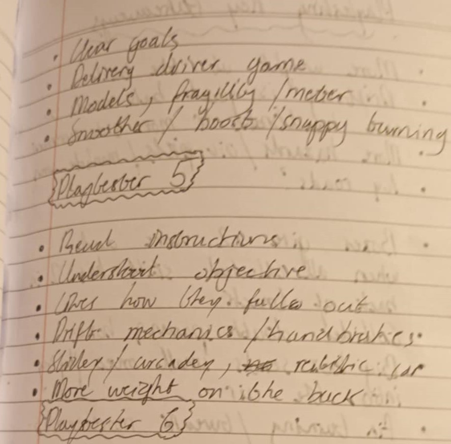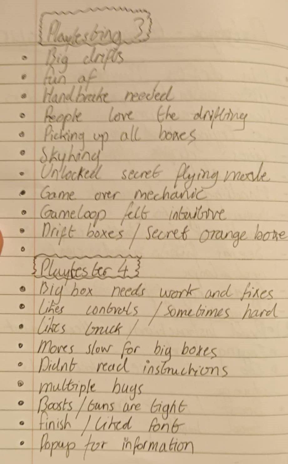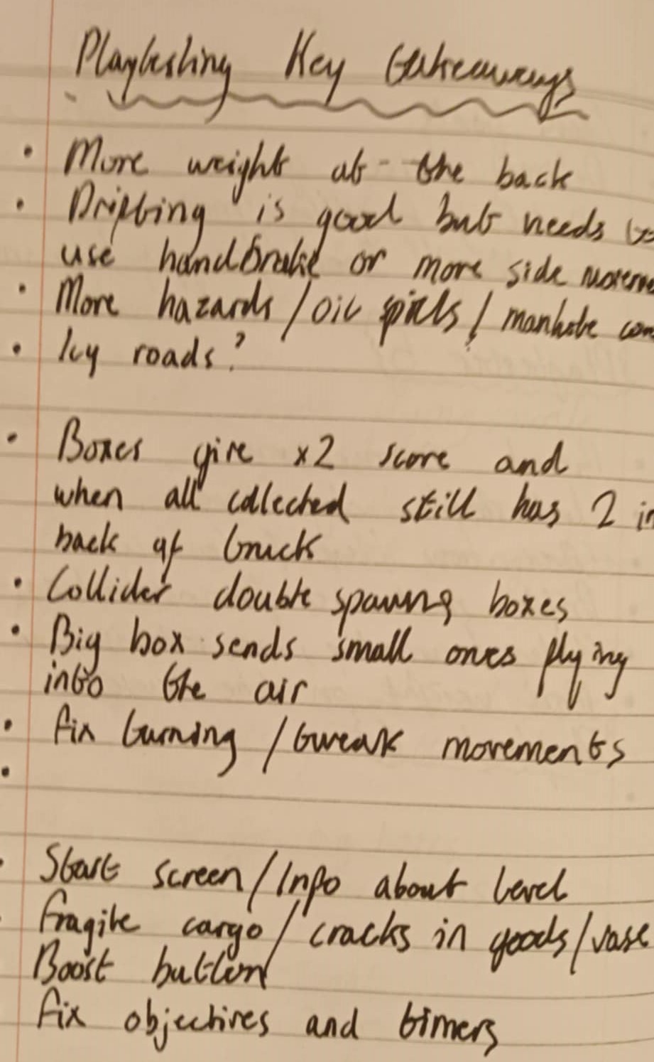 Both our playtests went really well, with positive feedback on the driving controls, both old and new, however we're sticking with the arcade feel. Many people wanted some way to drift, so I'll try add a hand-break to rotate and slow the car when pressing "SPACE" or something.