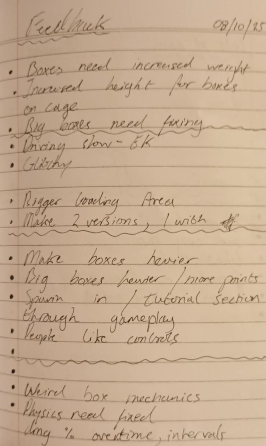 I found that spawning the boxes in the back and trying to control them was a fun mechanic, but after 2 weeks of testing nearly, it's been quite difficult to find a balance of fun and annoyance with the boxes constantly falling out when you turn. This was a recurring issue in playtests, with people liking the collection and control aspect, but disliking how easy it was to lose boxes and therefore, score.